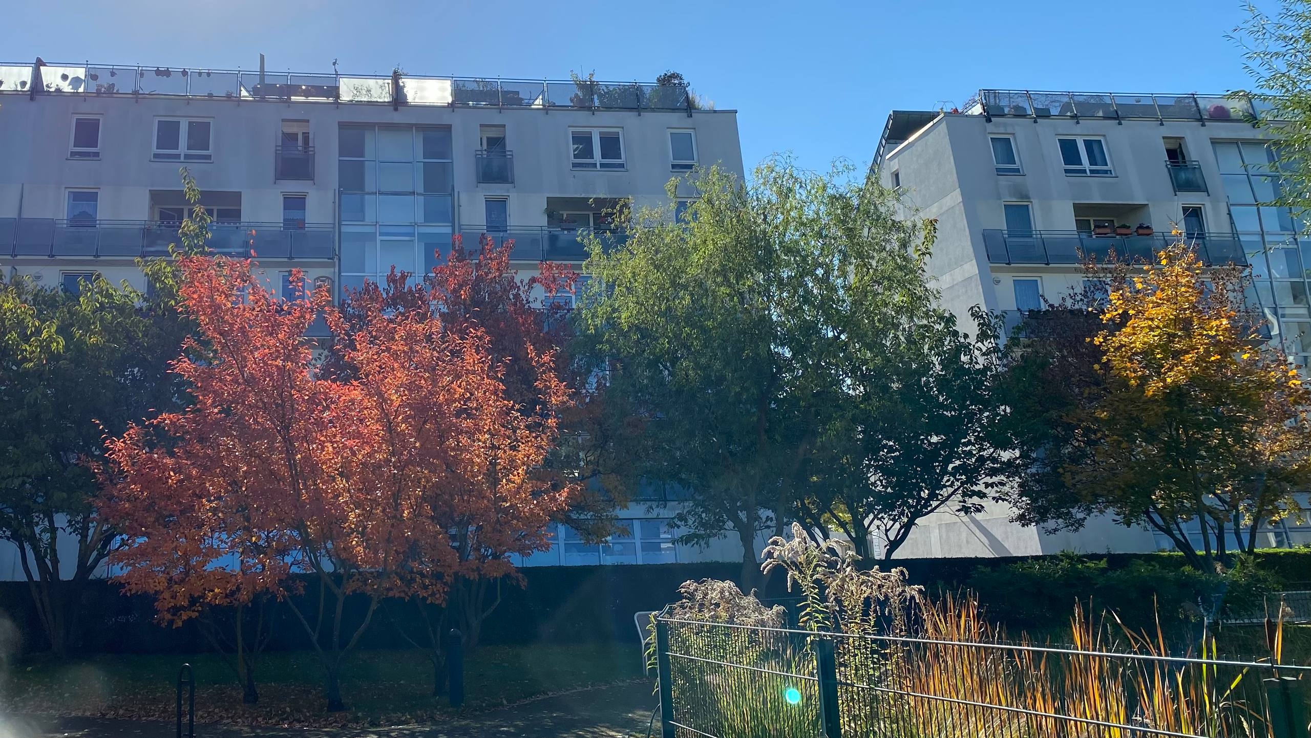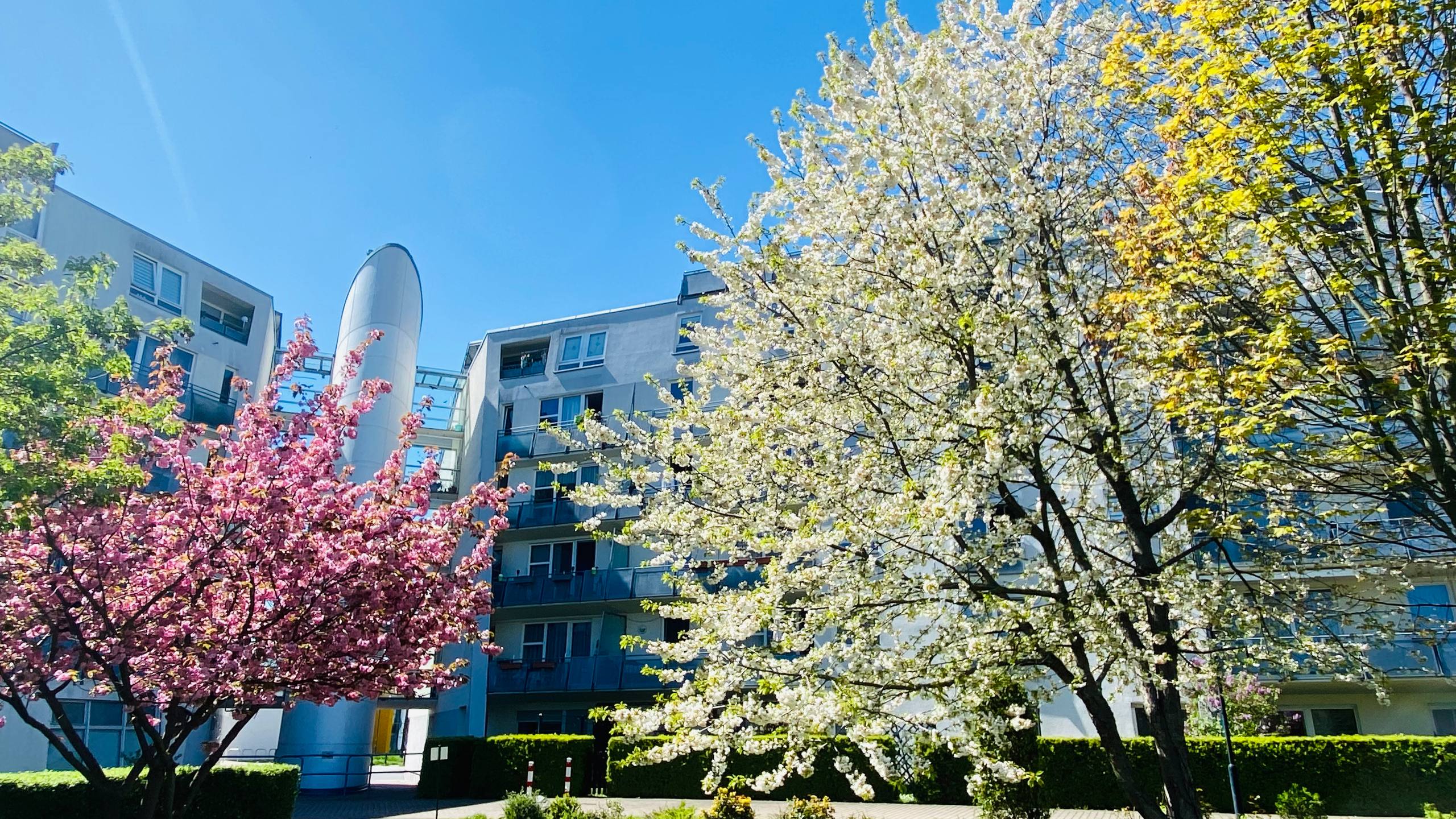 Zwischen den Gebäuden finden sich gepflegte Rasenflächen, Beete, Sträucher und kleine Wege, die zum Spazierengehen und Verweilen einladen.